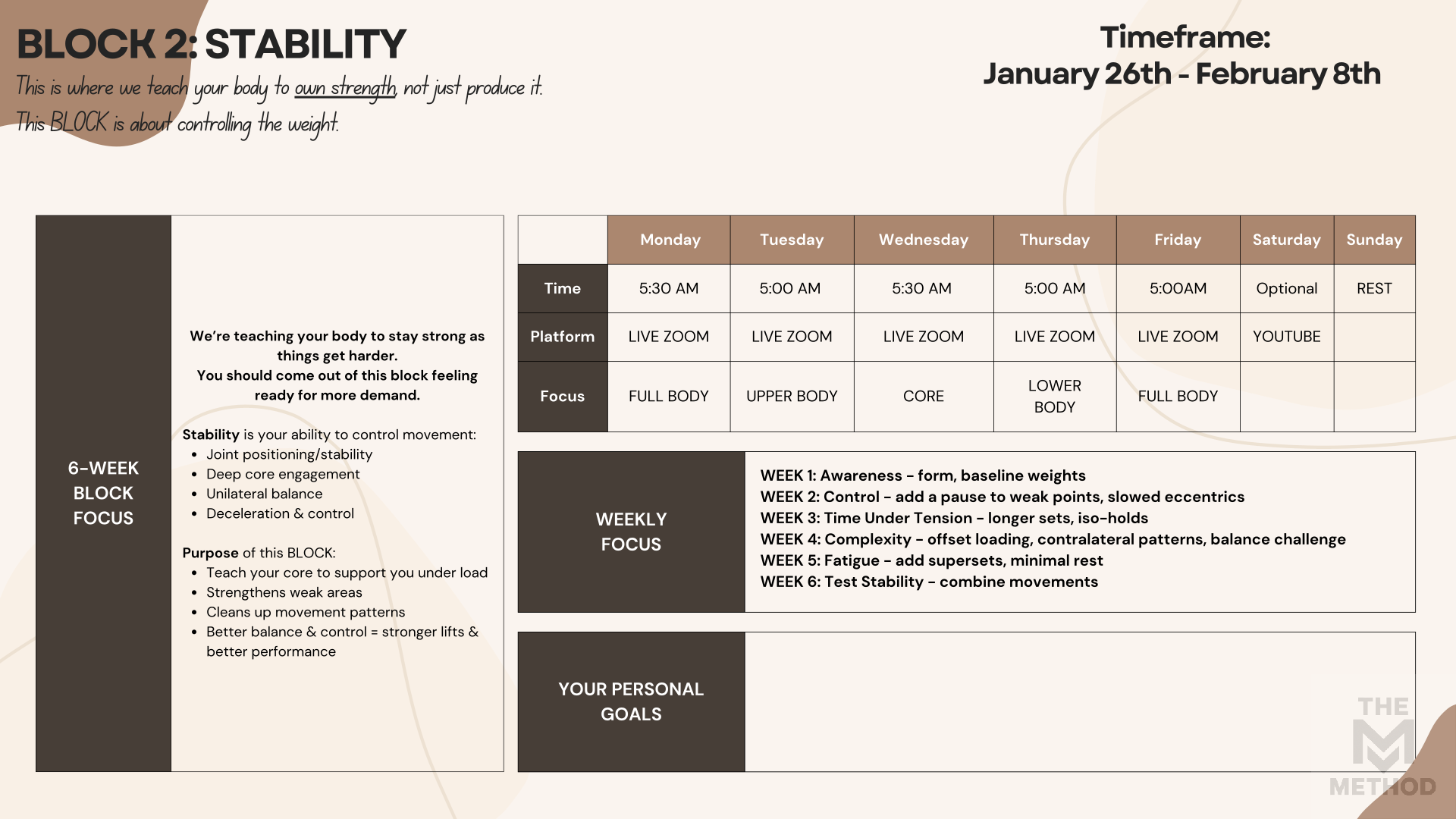 A lot of people follow programs that continuously do random exercises. Your body doesn’t change from chaos – it changes from repeated, intentional stress followed by recovery. Block training means we commit to a specific focus for a set period of time (6 weeks), so your body has enough exposure to certain movements to actually adapt, grow & CHANGE your body.